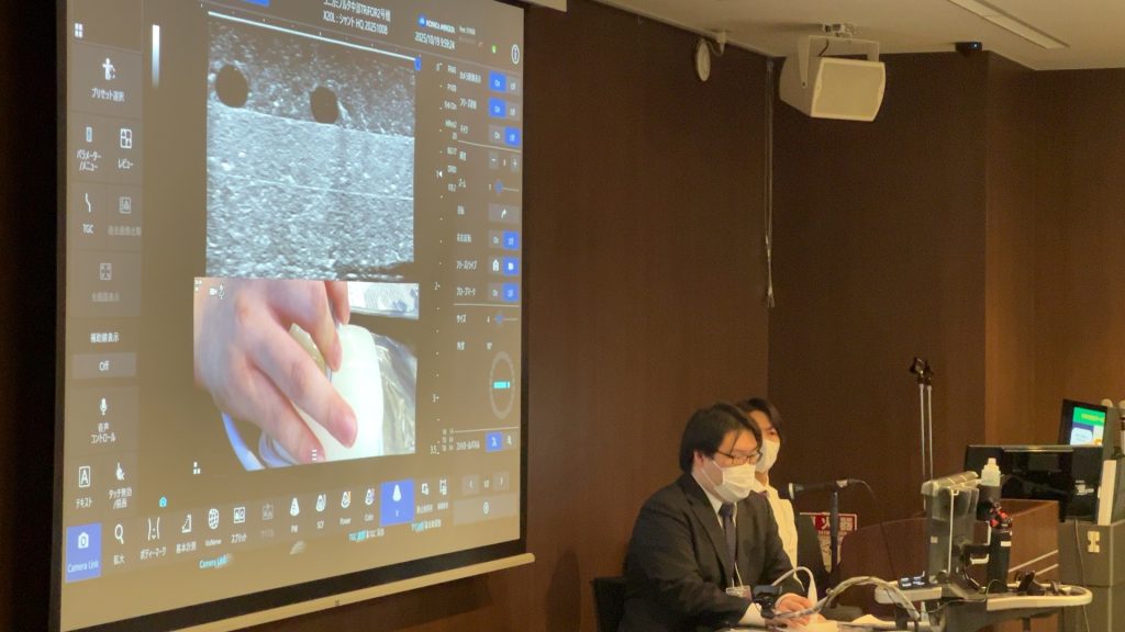 前半はエコー下穿刺の基礎についての座学と実技デモンストレーションが行われました。